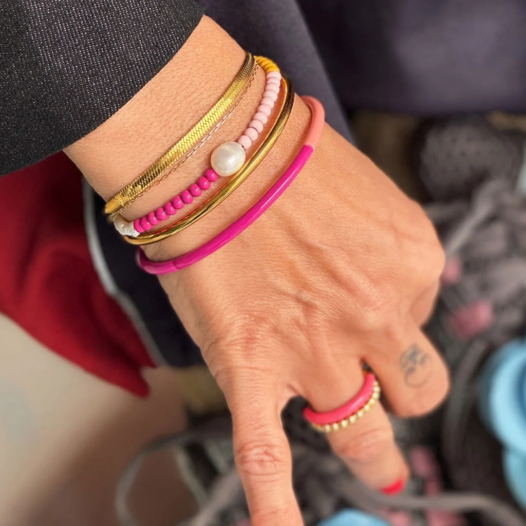 Den enkla, grafiska formen låter färgerna träda fram och skapar ett lugnt och balanserat uttryck. Ett litet stycke hantverk som tillför färg och personlighet till din look – lätt att bära för sig själv eller tillsammans med dina andra armband.