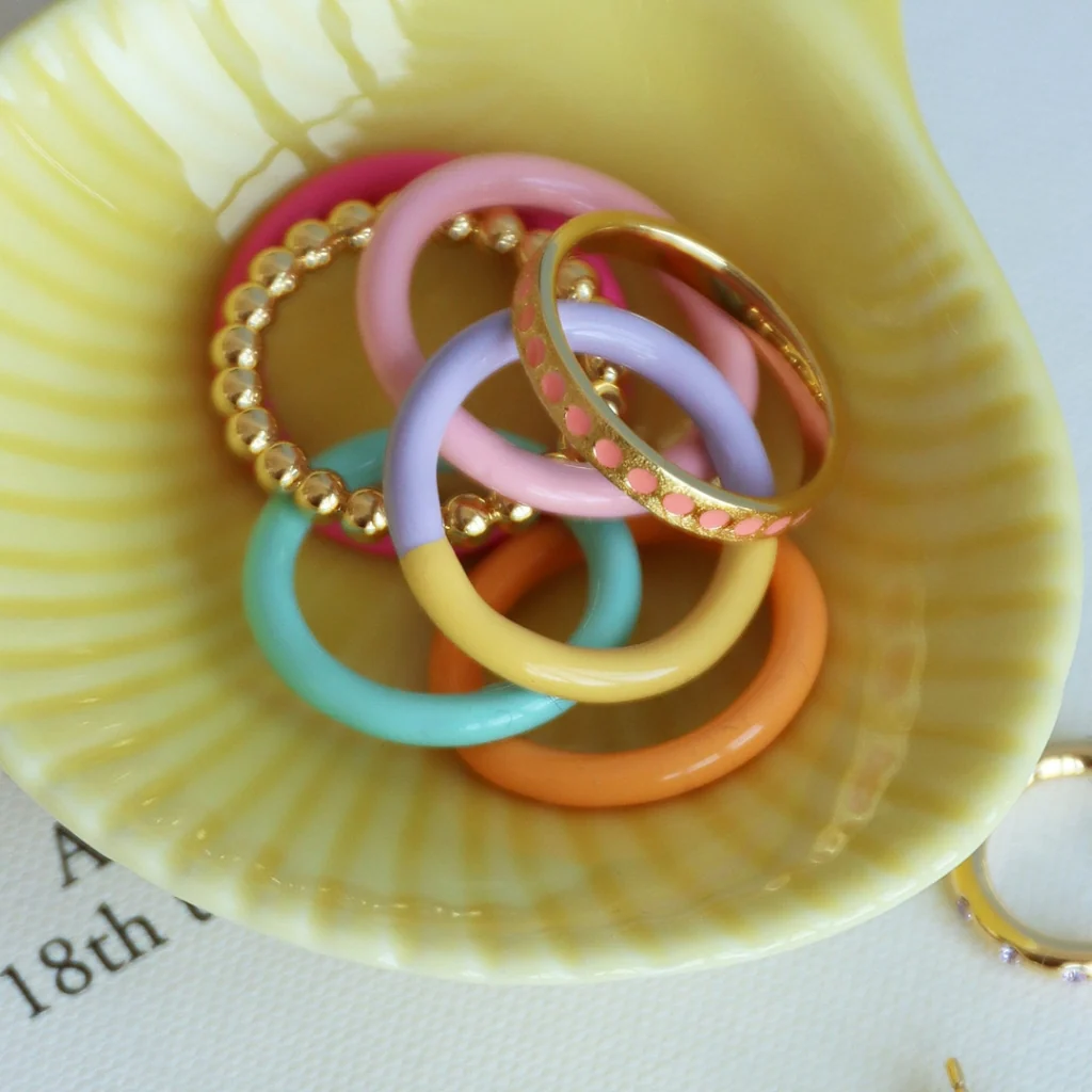 Våra enkla emaljringar kan snabbt sätta färg på din klädsel – året runt. Ringarna kan bäras individuellt eller så kan du välja dina favoritfärger från vårt sortiment och stapla dem på varandra. De har en exklusiv glansig yta som matchar dina guld- och silverringar.