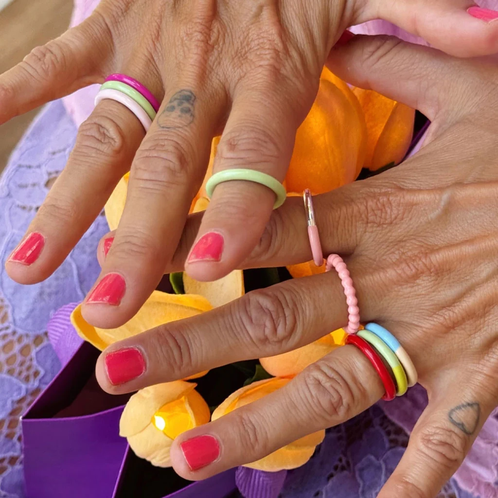 Våra enkla emaljringar kan snabbt sätta färg på din klädsel – året runt. Ringarna kan bäras individuellt eller så kan du välja dina favoritfärger från vårt sortiment och stapla dem på varandra. De har en exklusiv glansig yta som matchar dina guld- och silverringar.