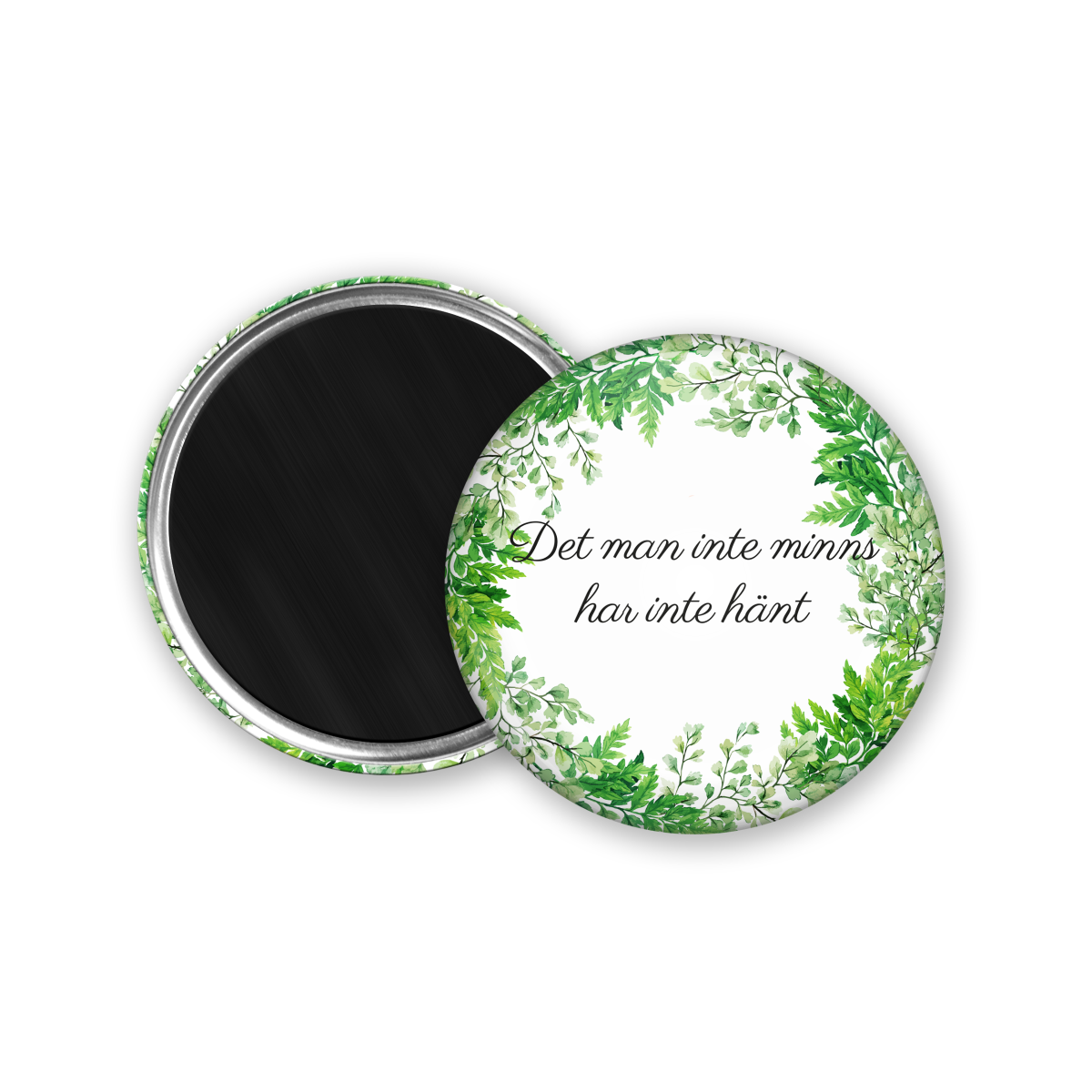 Kylskåpsmagnet i storleken 56 mm med texten ”Det man inte minns har inte hänt”.