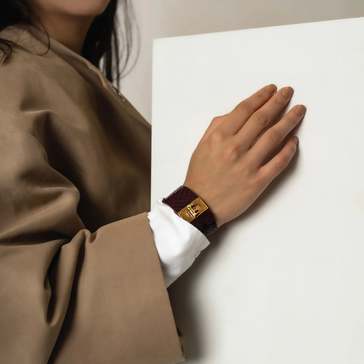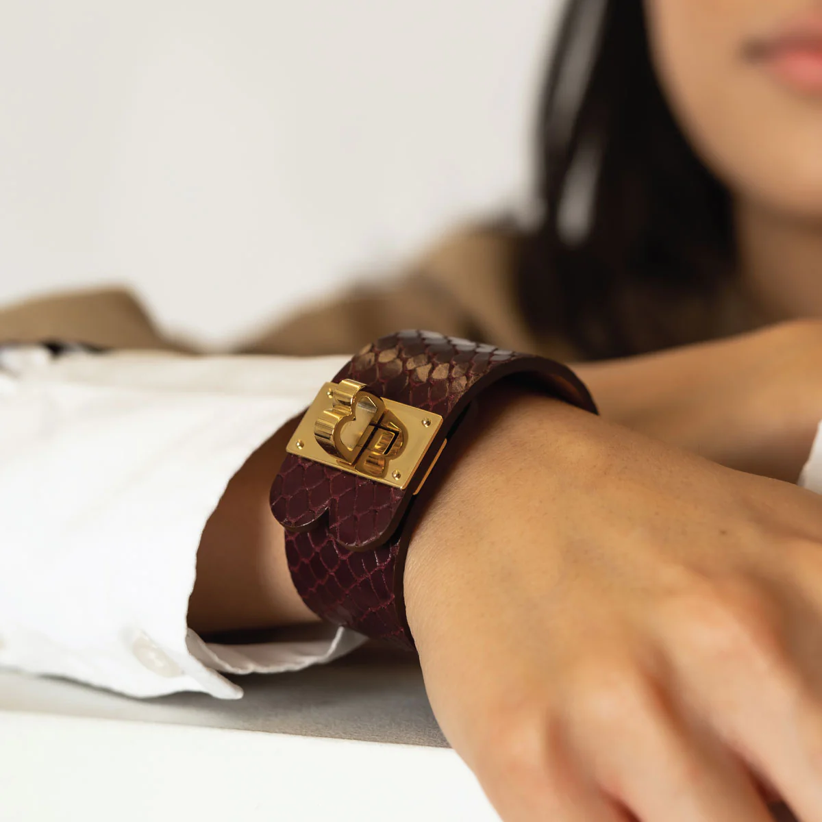 Material: Farrier is a two layer Italian calfskin bracelet, with a metal clasp in gold.