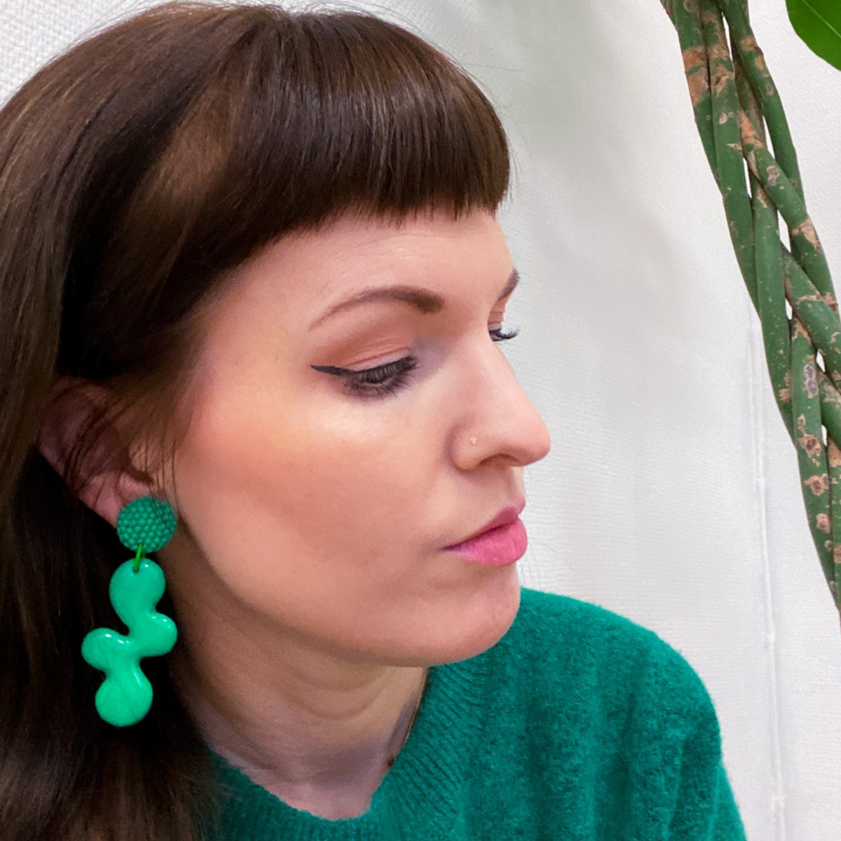 Läckra örhängen i polymerlera. En glänsande grön färg som flutit ut med ett stift täckt i matta prickar.