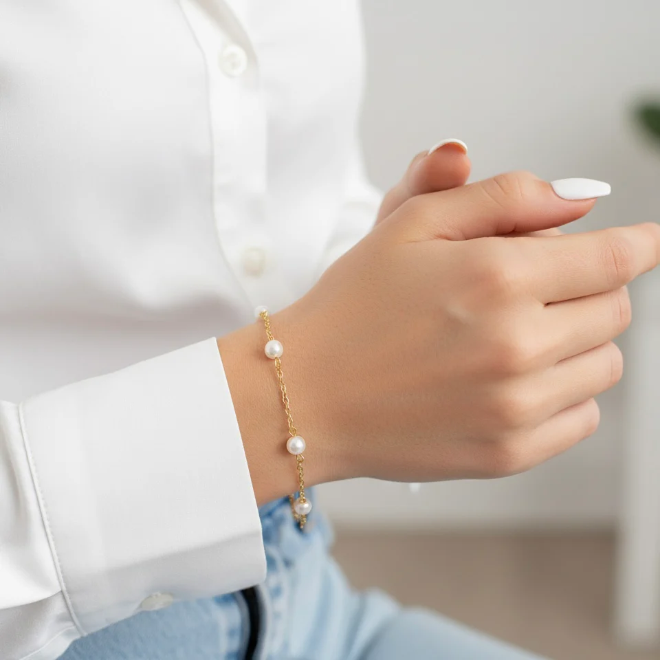 MINI PEARL CHAIN BRACELET – a classic bracelet with irresistible charm and maximum comfort.The bracelet consists of a thin cable chain adorned with small round pearls in two different sizes. Its minimalist design and understated look are perfect for those who like to stack their bracelets. The MINI PEARL CHAIN BRACELET is the bracelet that will never go out of style, an essence of the stylish and timeless character of pearl jewellery and an absolute must-have for your jewellery wardrobe.