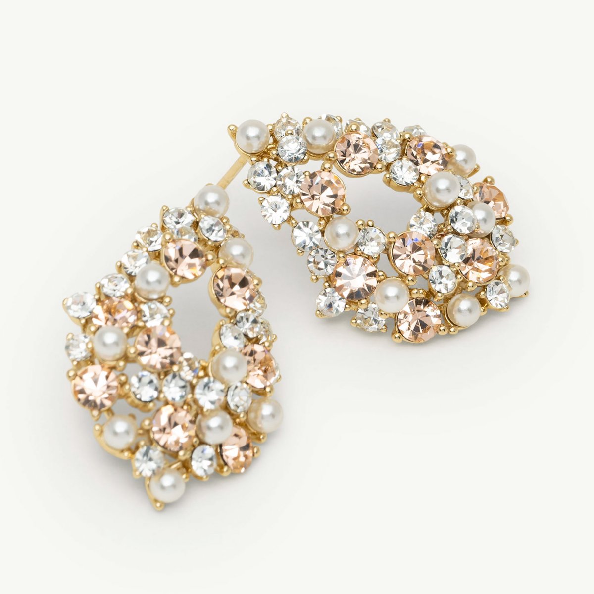 Our Alice earrings feature elegant ivory pearls along with clear and silk hued gemstones that reflect the light beautifully. Set in gold, wear them to add understated elegance to everyday looks. Match with our Miranda bracelet and ring.