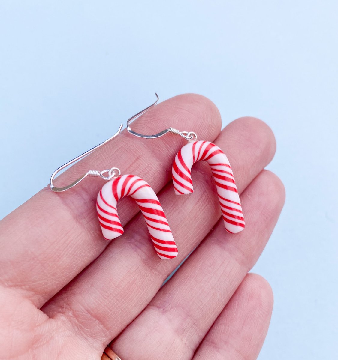 Handgjorda små söta polkagrisar att ha i öronen. Istället för att pynta granen så kan du pynta dig själv med dessa små röd-vit randiga polkagrisar.